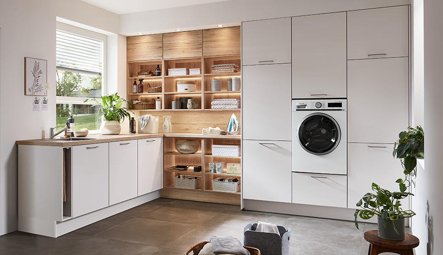 Met een wasmachinekast werk je apparaten strak weg en blijft de bijkeuken overzichtelijk. Zo oogt de ruimte opgeruimd, ook als er meerdere wasjes draaien.